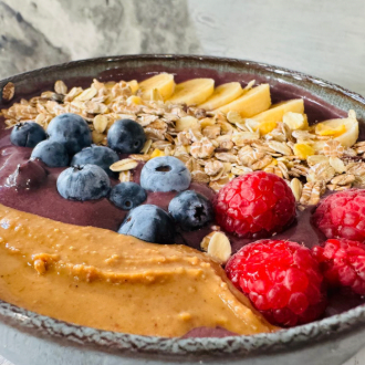 Preparado con açaí ecológico, plátano, manzana, frutos rojos, muesli y crema de cacahuete natural, este bol combina sabor, textura y nutrición en cada cucharada.